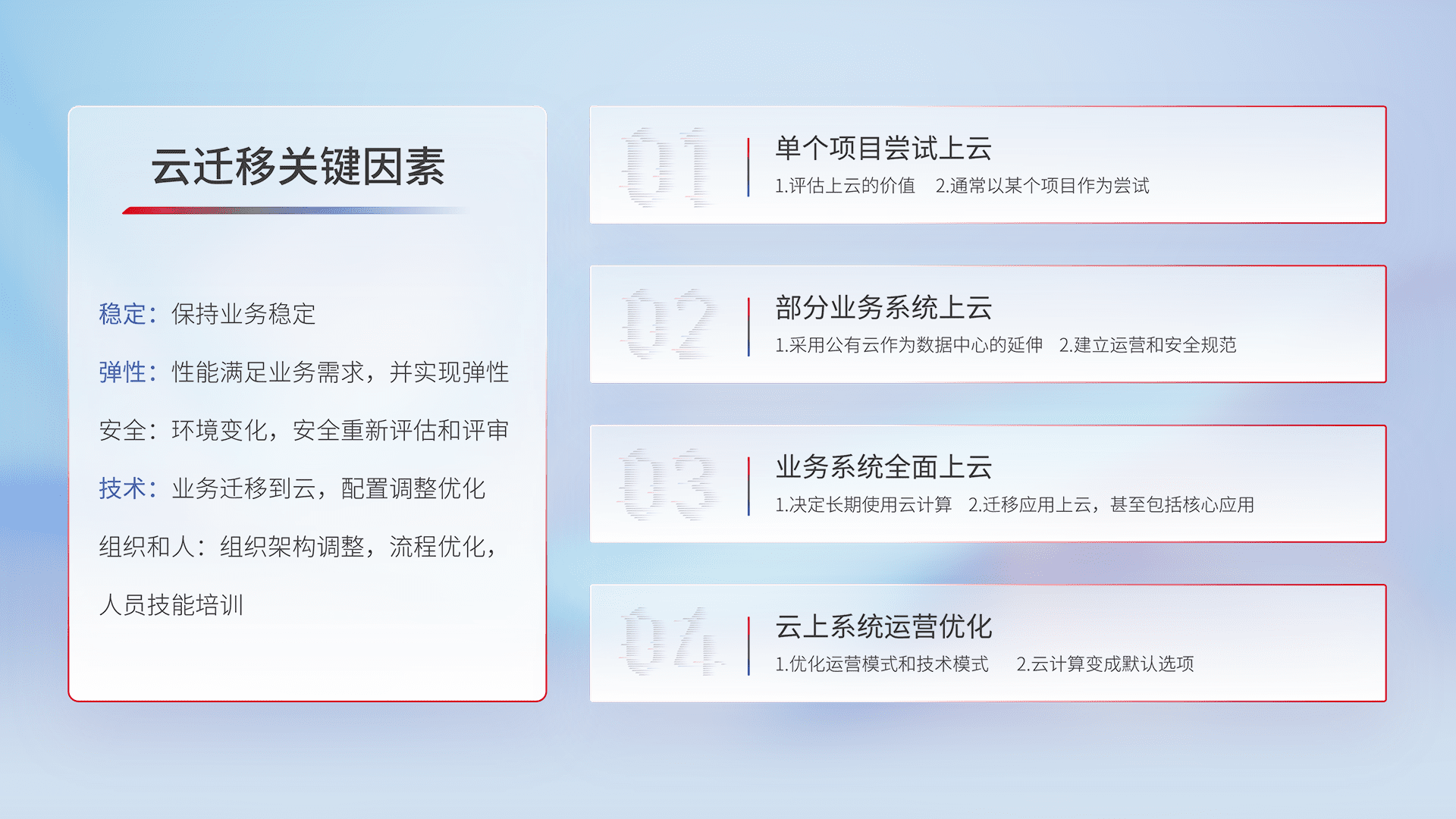 结合实际业务,,,,从规划设计、、、云平台选型、、云原生改造、、数据迁移、、、集成交付,,迁移全过程为客户识别最佳上云路径,,,做好风险识别管理,,,,设计网络架构、、身份权限、、、安全审计合规、、、、操作审计、、、日志审计、、监控告警策略、、多站点容灾设计等,,,对云上基础设施进行整体规划,,提升IT治理水平,,,以满足弹性、、、、高可用、、、高性能的需求。。。