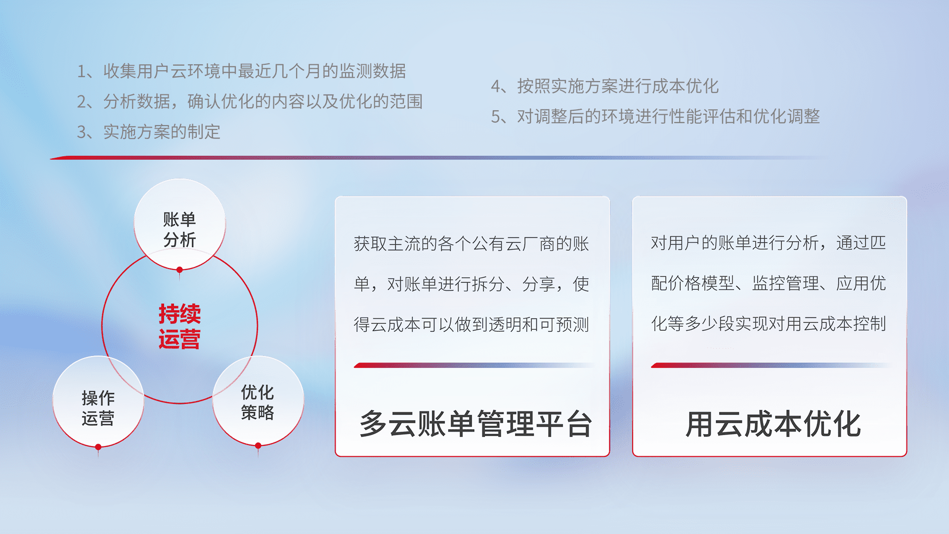 通过多云纳管,,,以统一的资源数据模型把客户的云资源进行抽象和封装,,,,进而实现对多云资源的统一操作,,,,保障云资源管理的可靠性、、稳定性与可用性。。。量身定制化运维内容,,,,配置、、、开发运维、、、、补丁管理、、、备份、、监控、、、、认证和访问管理、、、审计和日常巡检等,,,保障在用云过程中的可靠度,,稳定度以及高可用率。。。。